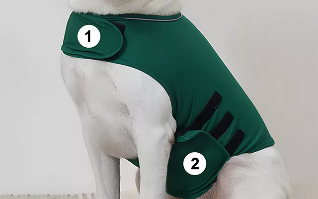 Dit kalmerende vest heeft twee klittenbandsluitingen. Het zit strak om je hond en geeft zo een veiliger gevoel.