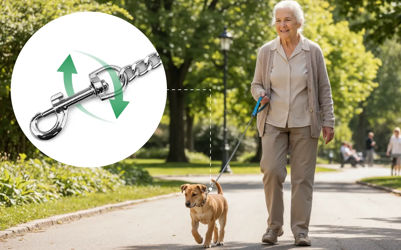 Beweeg vrij zonder knopen of gedraaide lijnen. De slimme haak draait zodat huisdieren veilig naast je meelopen.