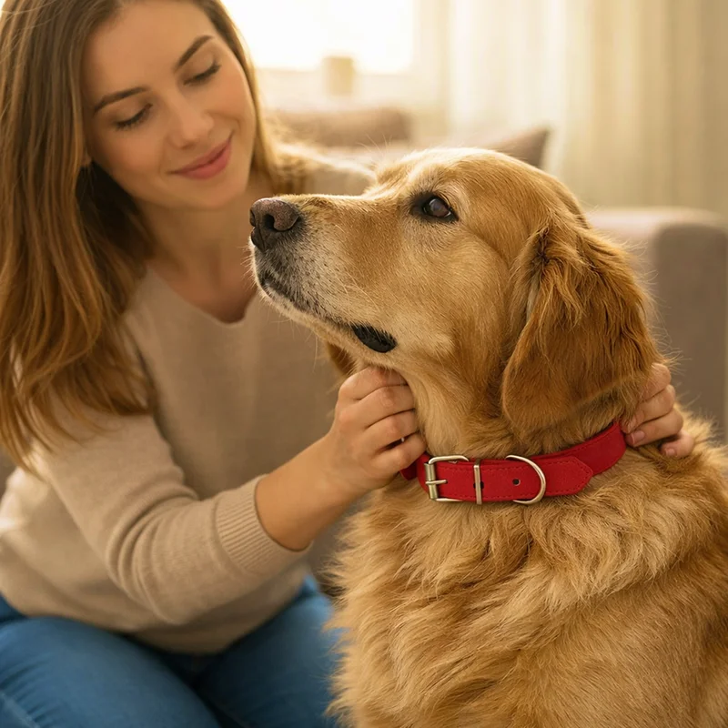Onze hond draagt deze elke dag. Hij past perfect en ziet er zo cool uit. Het materiaal laat helemaal geen sporen achter op zijn nek.