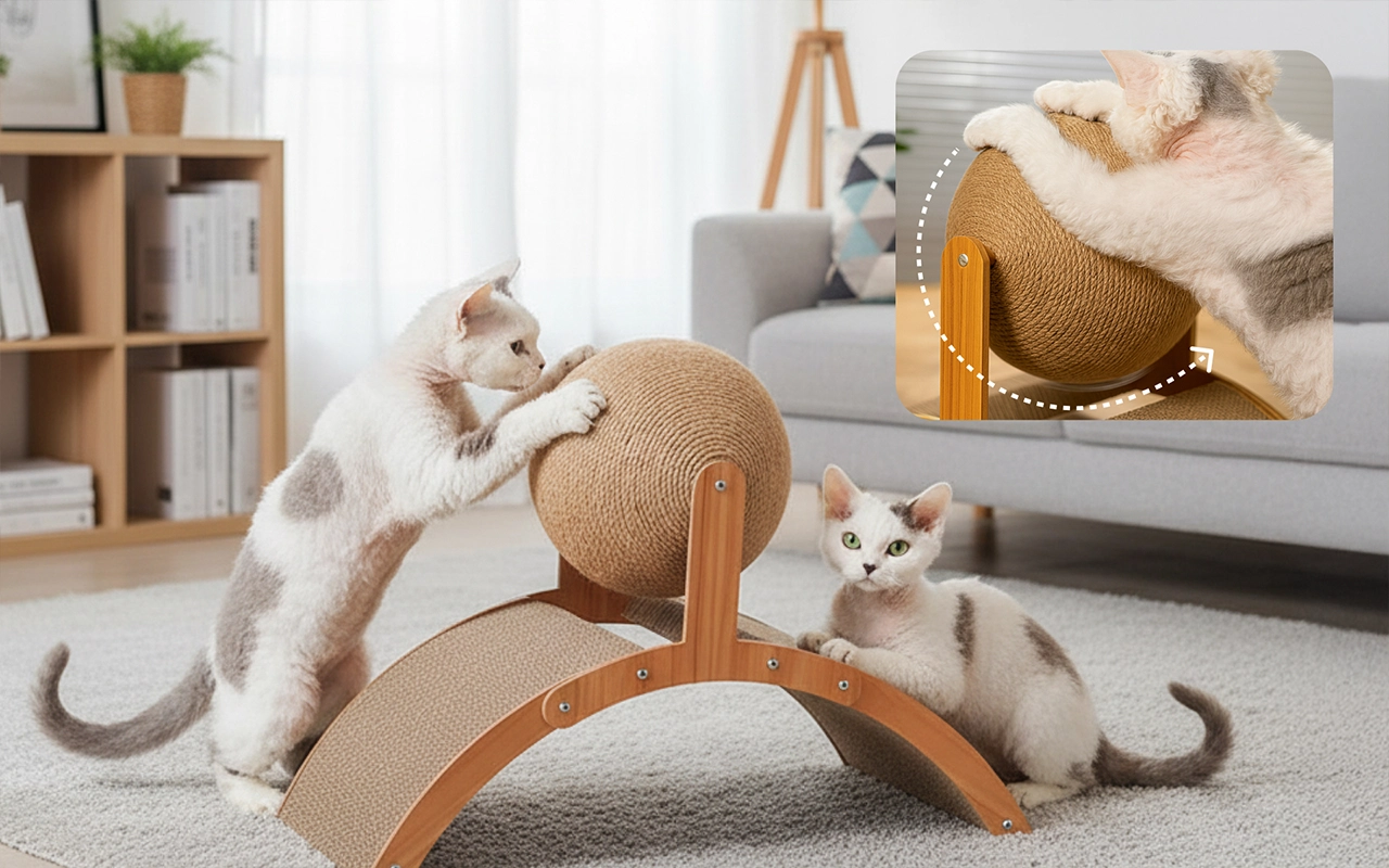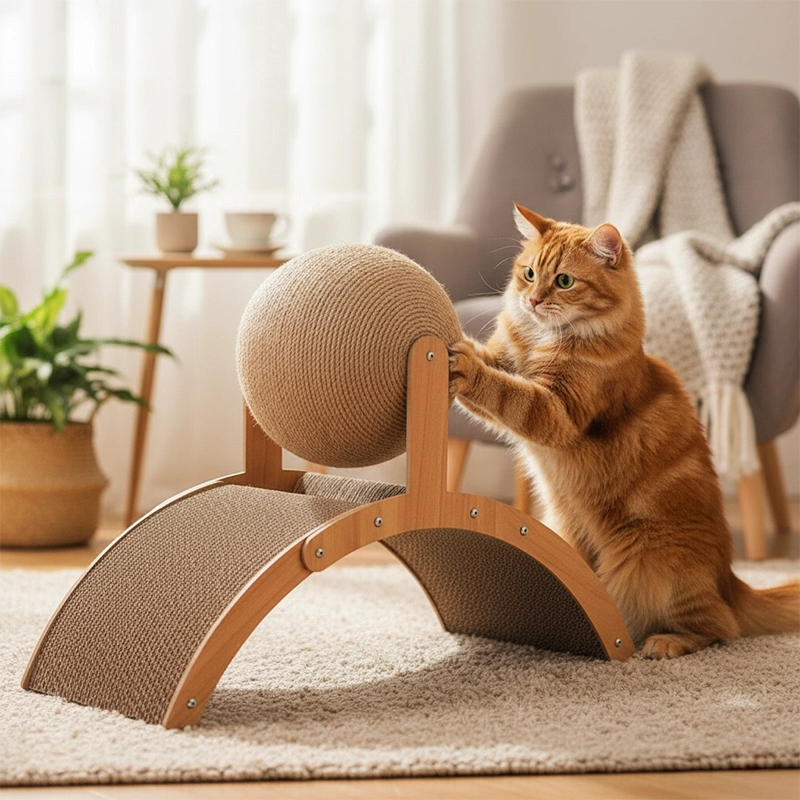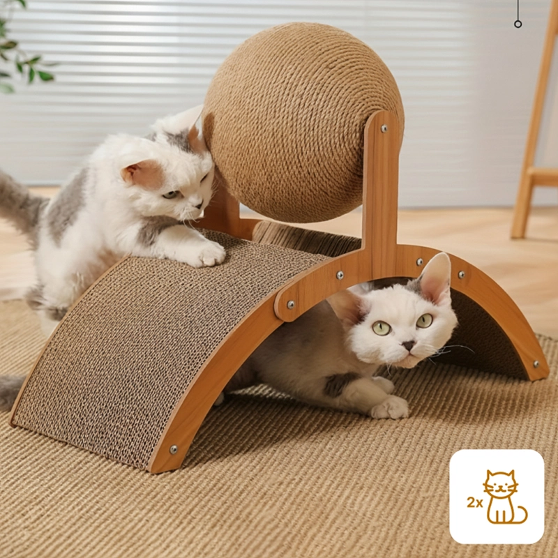 Gebogen brug en draaiende bal zorgen voor eindeloos plezier. Katten onderzoeken, krabben en ontspannen bij elk gebruik.