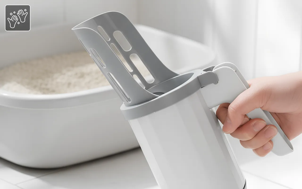 De rommel rondom de kattenbak is voorgoed weg! Ik schep, knoop het zakje dicht en gooi het weg. De kattenbak schoonmaken is eindelijk makkelijk.