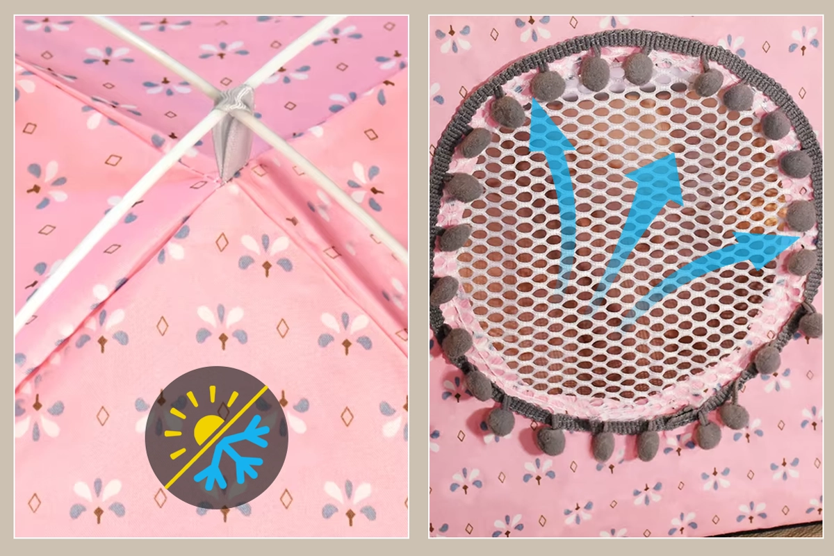 Ademend materiaal houdt huisdieren koel tijdens warme dagen. Geïsoleerde wanden zorgen ook voor warmte wanneer het kouder wordt.