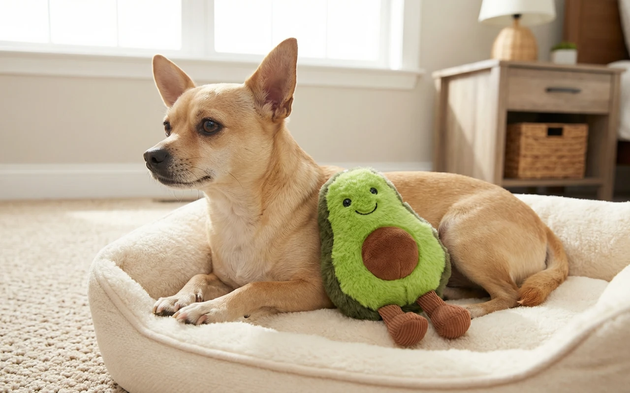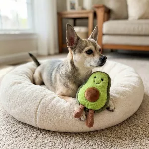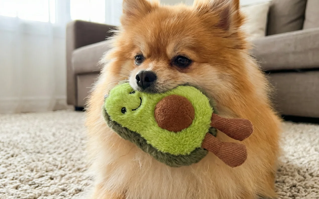 Mijn pup was meteen dol op haar avocado kauwspeeltje, ze neemt het zelfs mee naar bed. Het zachte fleece is geweldig voor haar tanden. Super schattig ook!