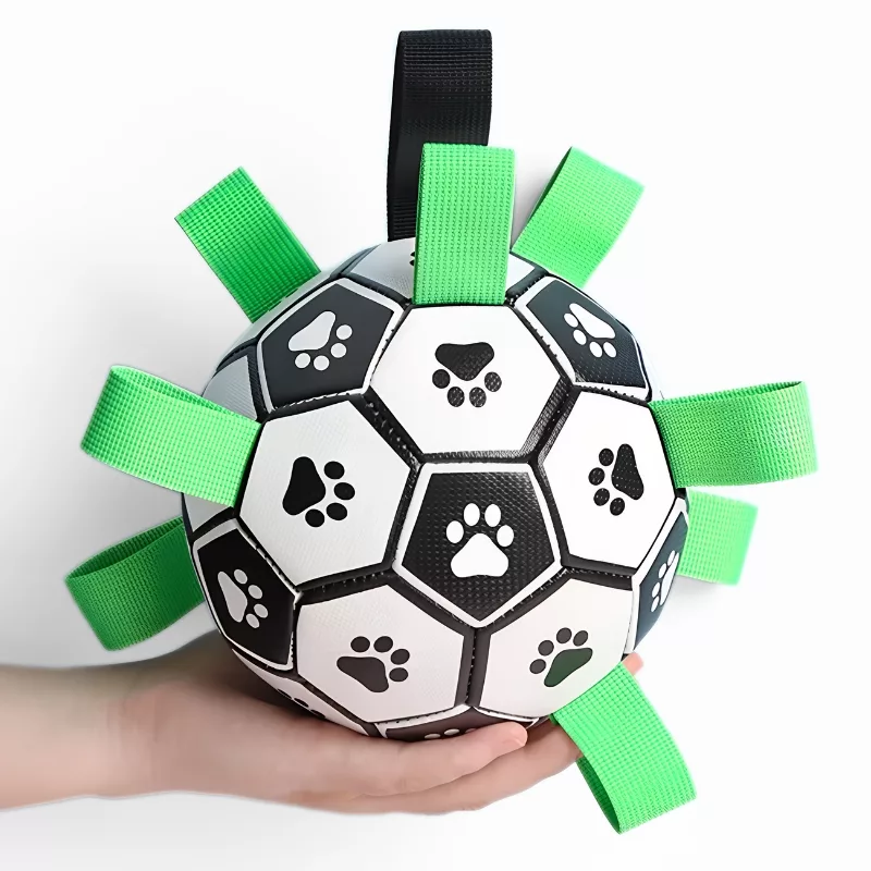 Mijn hond wordt helemaal gek van deze voetbal. De grijptabs maken het zo makkelijk om samen touwtje te trekken. Beste speeltijd ooit!