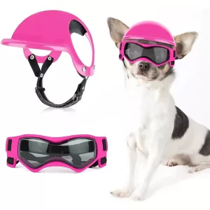 Ik rijd graag op mijn scooter met mijn kleine hond. De helm zit echt goed en de brilletjes houden insecten uit zijn ogen. Hij ziet er nu super stoer uit!