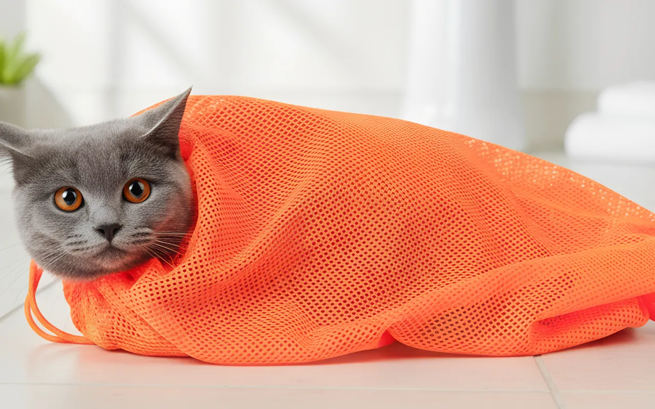 De netzak helpt me om de nagels van mijn kat te knippen.