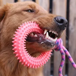 Mijn zes maanden oude hondenmix kauwt op alles, maar deze bijtring houdt haar eindelijk bezig. De kleine spikes lijken zelfs haar adem wat frisser te maken.