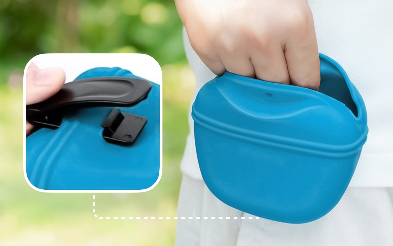 Ik hoef me nooit meer zorgen te maken over het morsen van snacks. Het tasje houdt precies genoeg beloningen vast en dankzij het omklapdesign is schoonmaken super simpel.