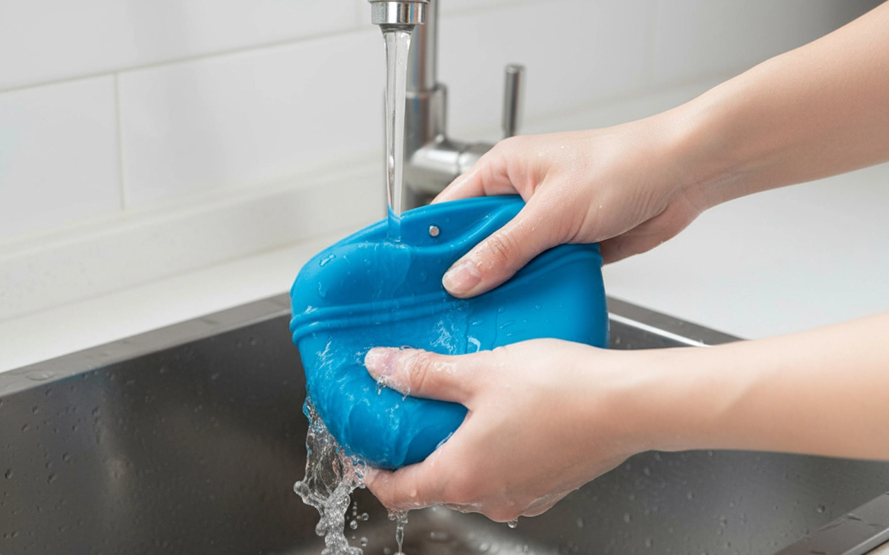 Schoonmaken duurt slechts enkele seconden, dus het tasje blijft fris en hygiënisch. Siliconen keert gemakkelijk binnenstebuiten voor een grondige spoeling na elk gebruik.
