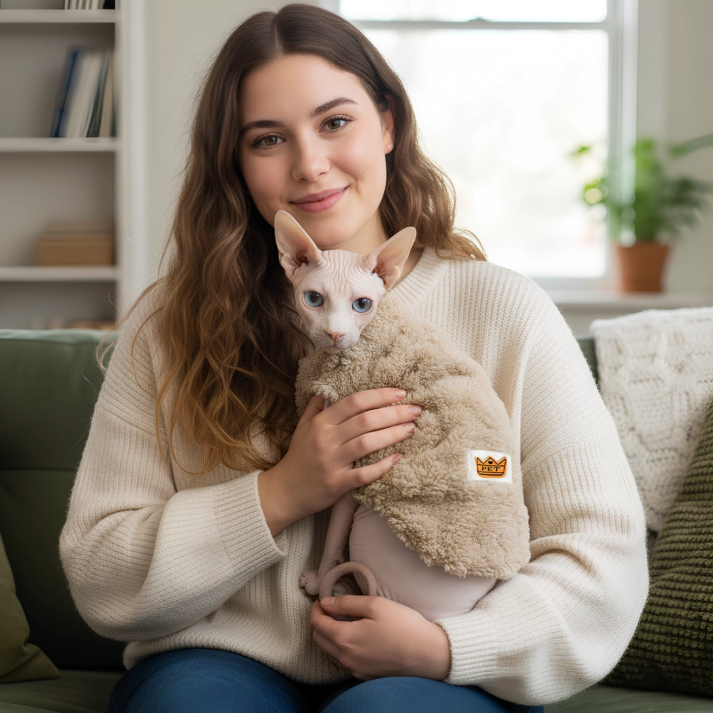 Onze oudere kat heeft eindelijk een trui gevonden waar ze geen jeuk van krijgt. Ze slaapt nu veel knusser en knuffelt graag met ons.